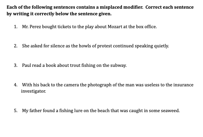Correction - Hoping to garner favor my new boyfriend brought my. Searching my wallet my drivers license was found. Dangling and misplaced modifiers test quiz.